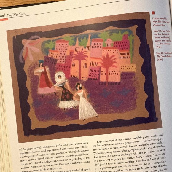 “Walt instinctively understood that Blair’s assertive art was in sync with the changing times and future projects. The delicate Arthur Rackham-like fairy tale illustrations that inspired Snow White and The Seven Dwarfs were out; bold graphics, stylization and surrealism were in, as exemplified in the phantasmagoria of The Three Caballeros.”